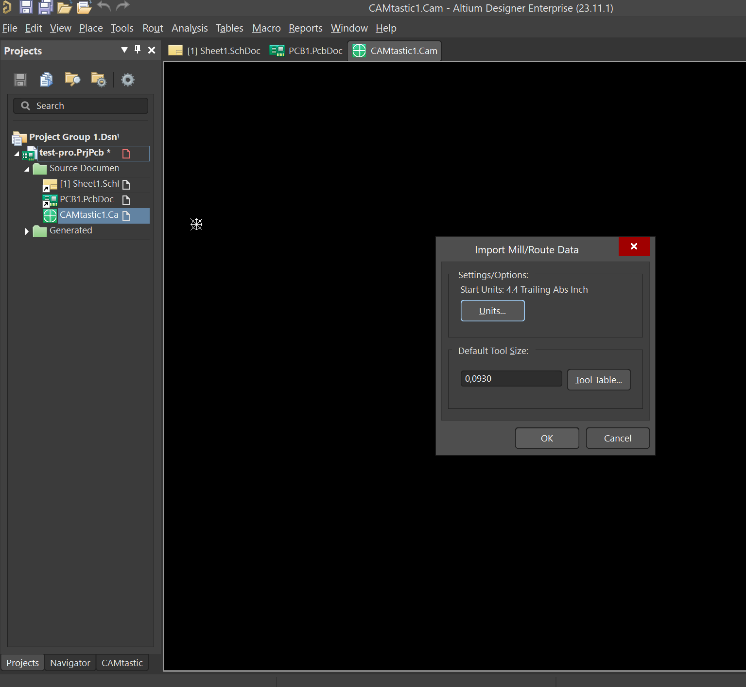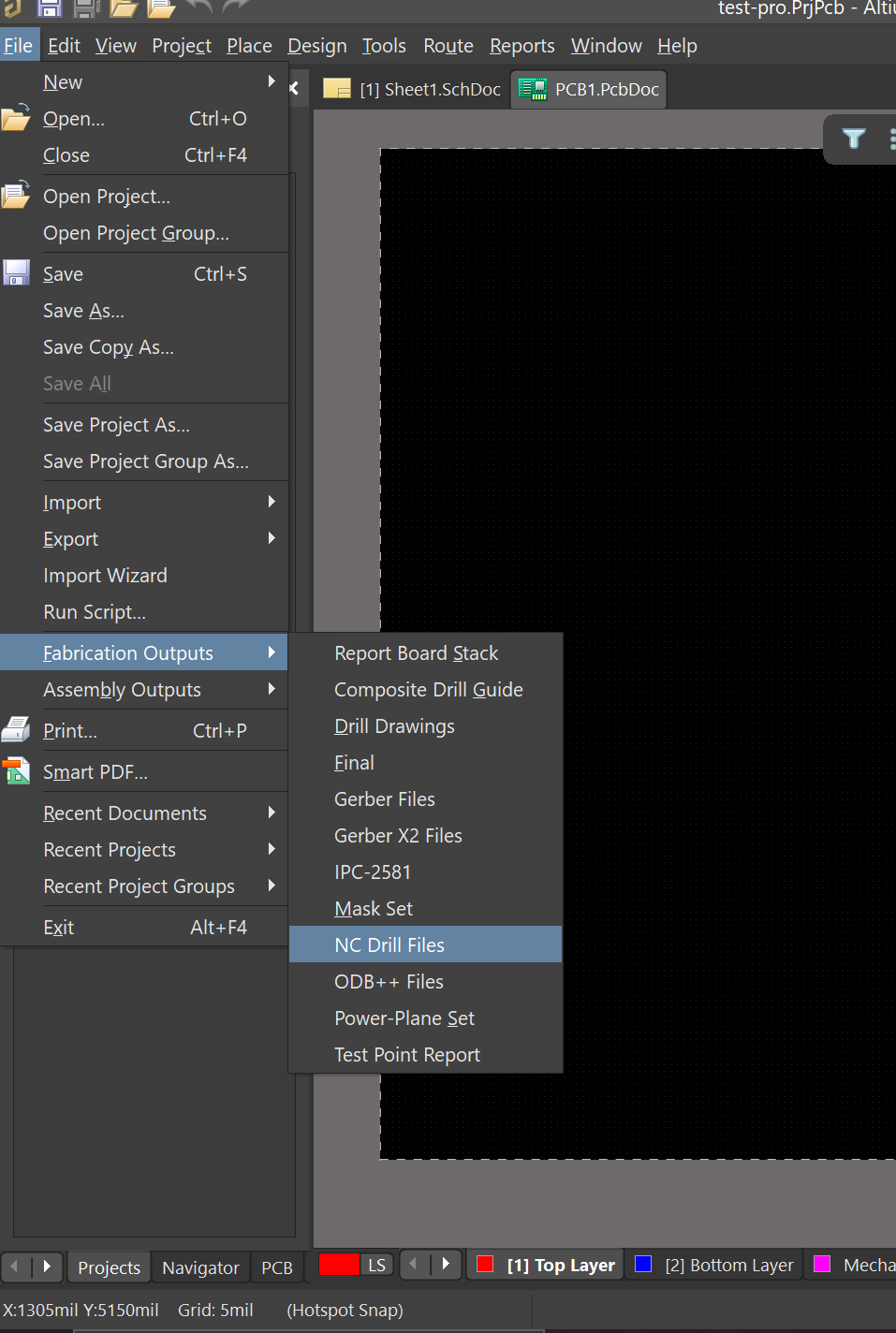 از تب بار بالا file و سپس Fabrication Outputs و در اخر گزینه NC Drill Files را انتخاب می کنیم .