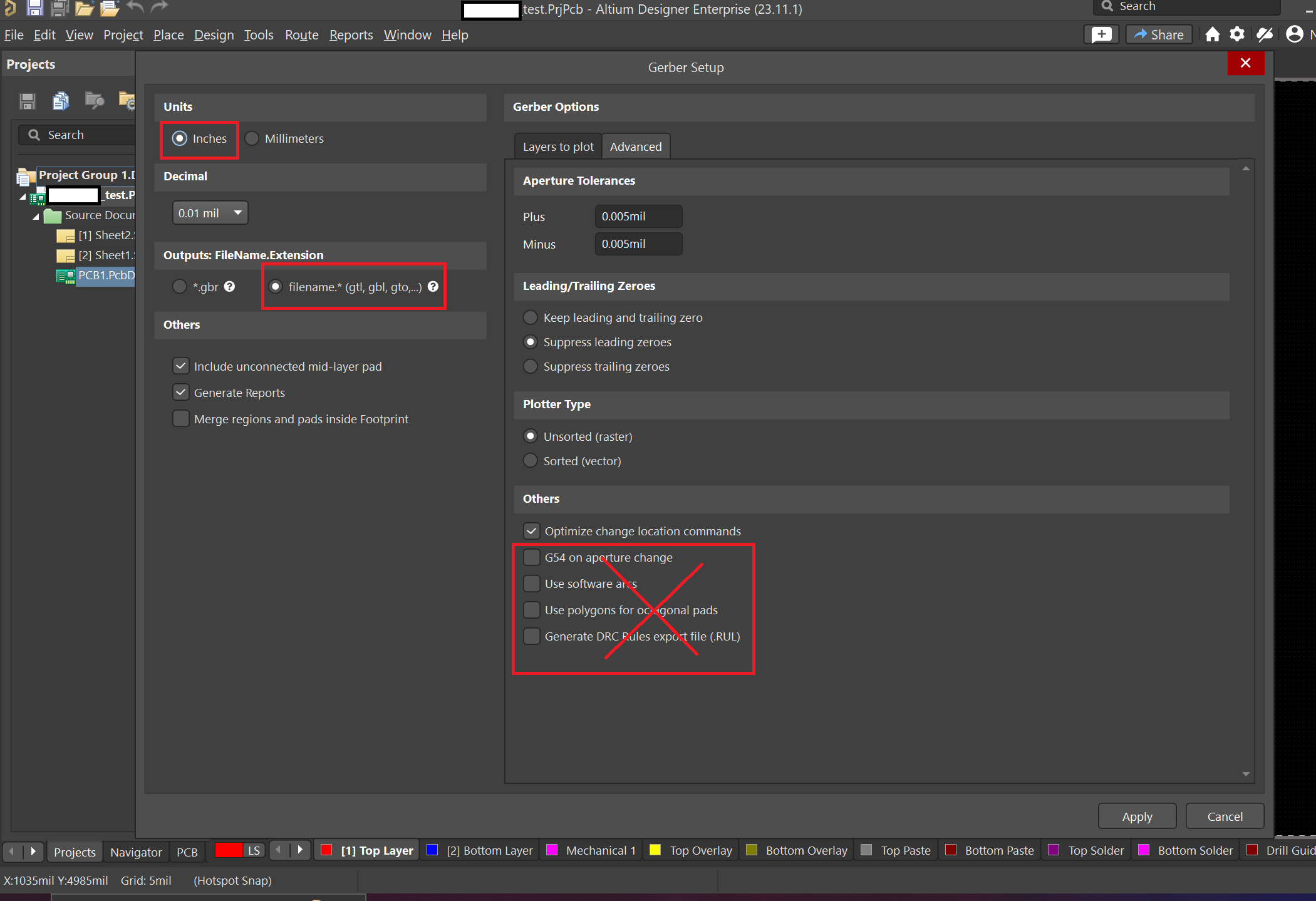 پس از آن پنجره زیر باز می شود که طبق تصویر Units را بر روی inches گذاشته و Outputs را بر روی filename.*(gtl,gbl,gto,…) می گذاریم .