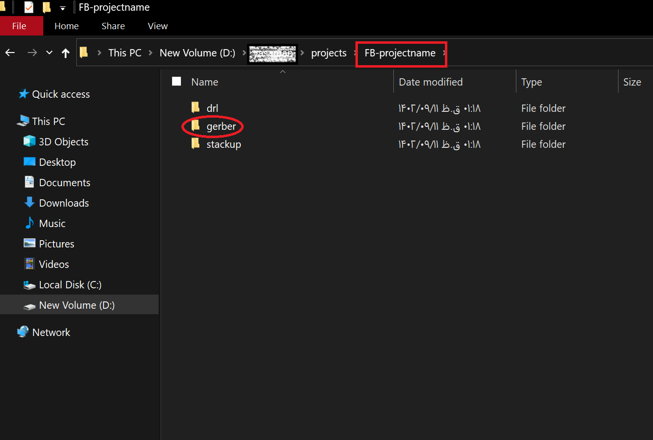سپس باید به سراغ محل ساخت پروژه رفته و وارد فولدر Project Outputs شویم و تمام محتوایات فولدر را کات و داخل فولدر gerber (فایلی به این نام داخل یک فولدر با نام پروژه مانند FB-Projectname بسازید به همراه دو فایل drl و stackup مشابه شکل) قرار دهید.
